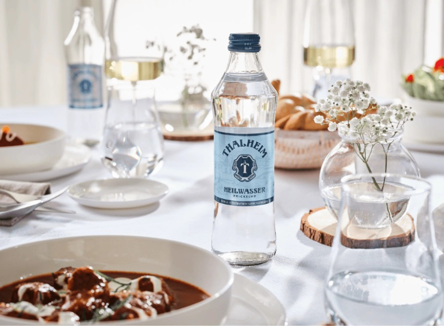 In vielen sensorischen Tastings und Pairings mit Expert:innen aus Gastronomie und Sommellerie und auch Winzer hat sich Wasser als besonders passender Begleiter zu Wein hervorgetan - und eines davon ganz besonders: das Thalheimer Wasser. Warum das so ist, erklärt Wasser-Sommelière Gerlinde Mock: „Die harmonische Mineralisierung und die feinperlige Kohlensäure machen die Geschmacksnerven wieder aufnahmefähiger für die Aromen des folgenden Weins. Außerdem ist das enthaltene Hydrogencarbonat ein guter Säurepuffer für Magen und Darm und kann Sodbrennen vorbeugen.“